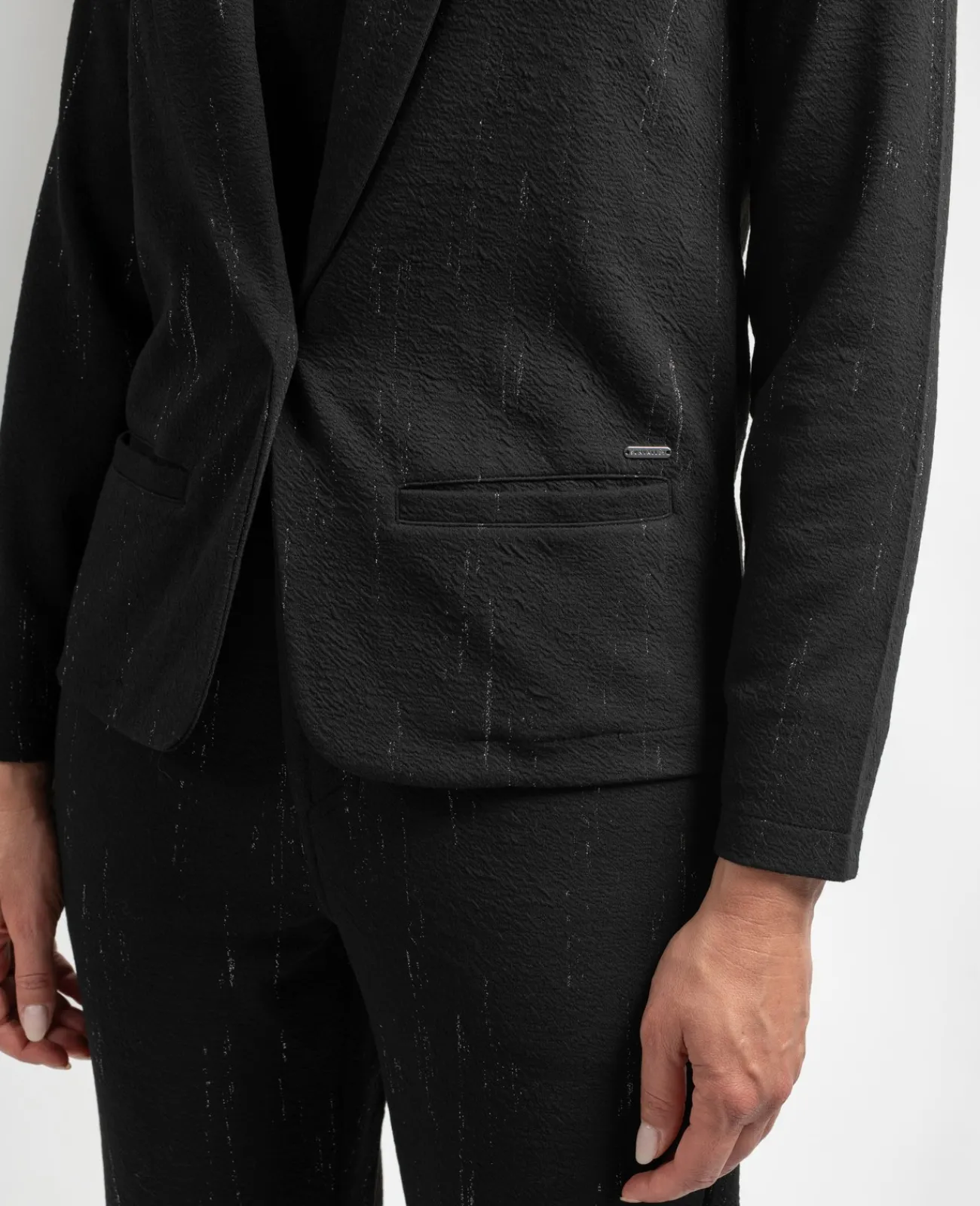 Coupe près du corps et matière stretch pour cette veste imprimée qui se pare d’un fil lurex pour un aspect brillant. Pour un total look vous pouvez la porter avec notre pantalon Voilon.