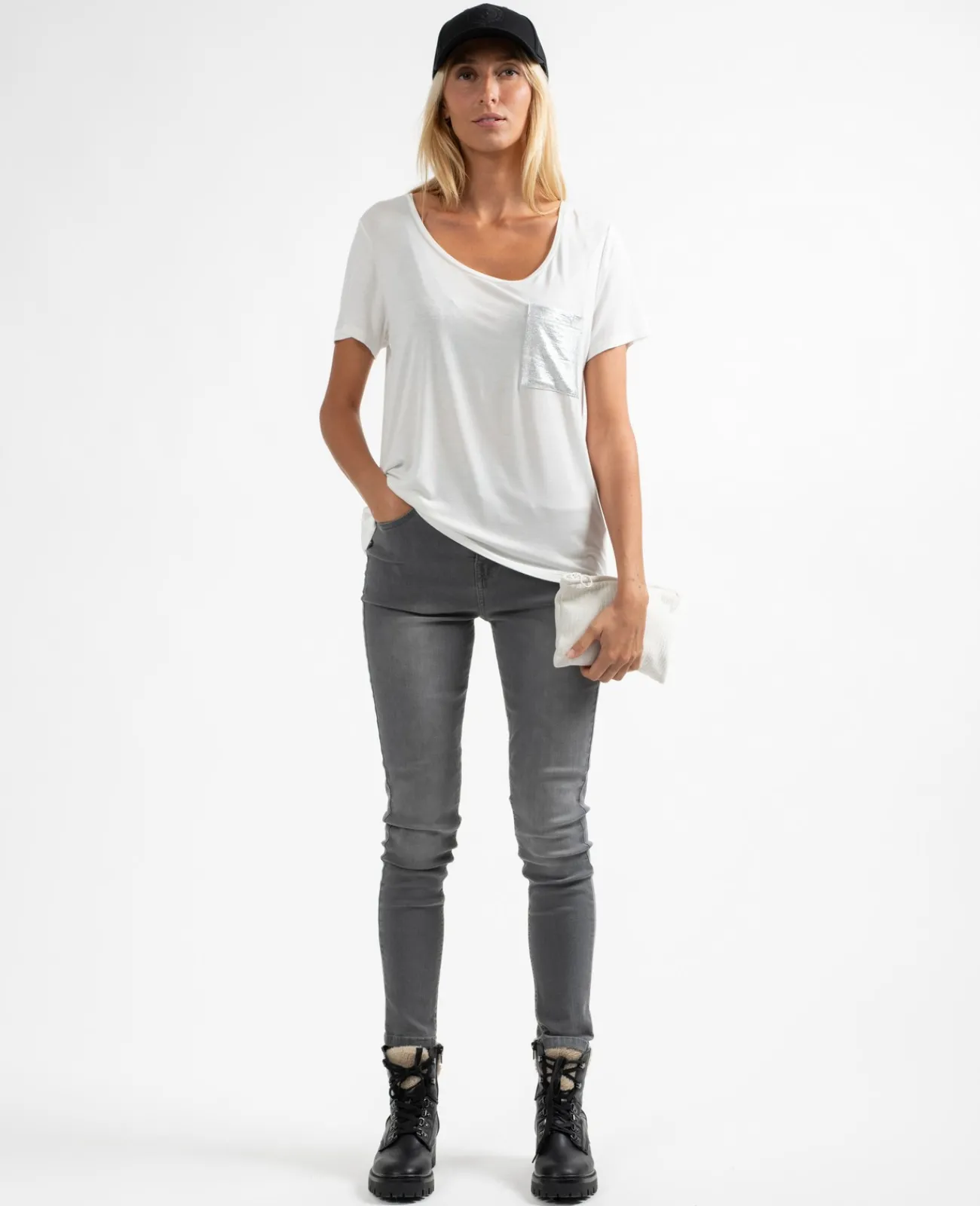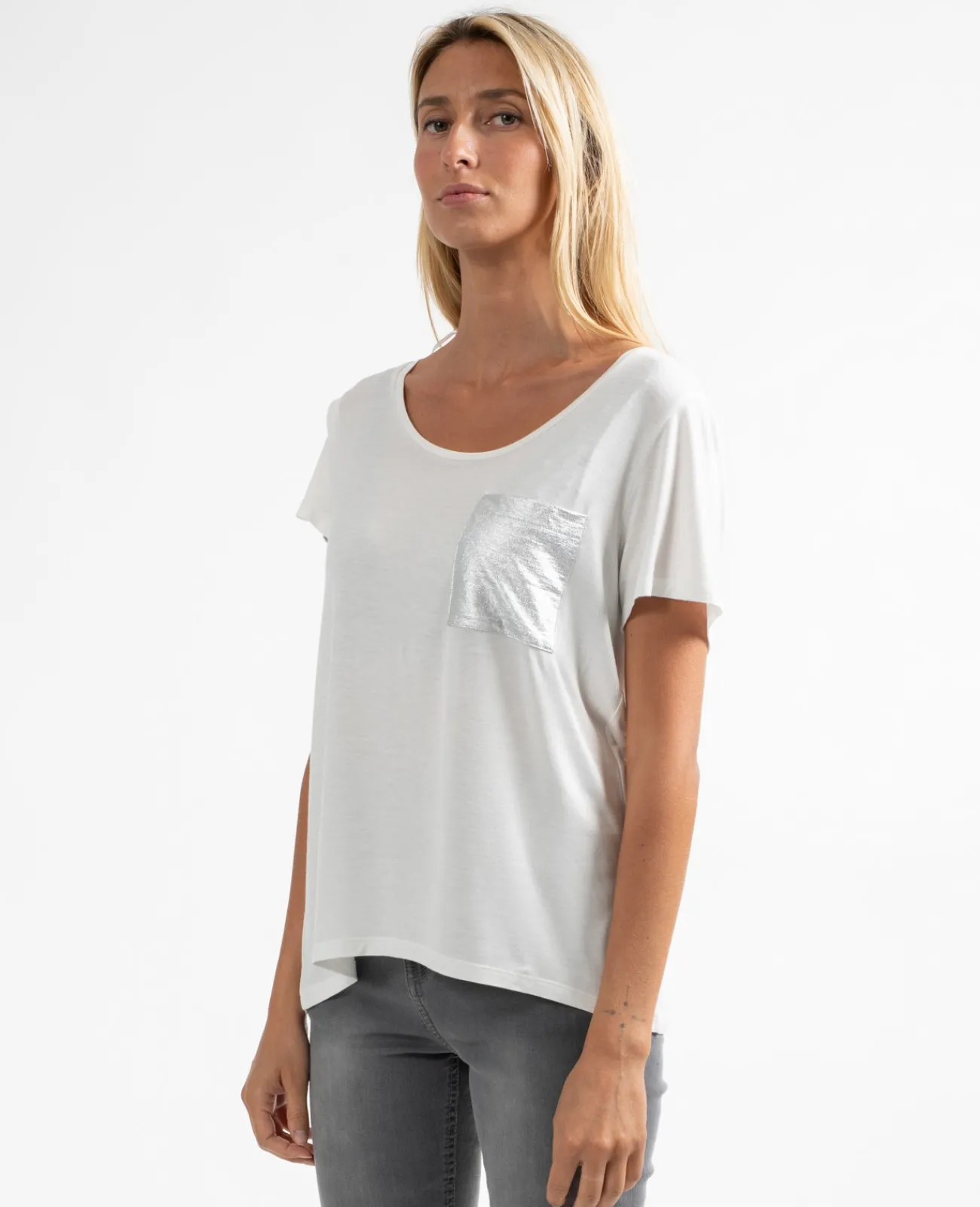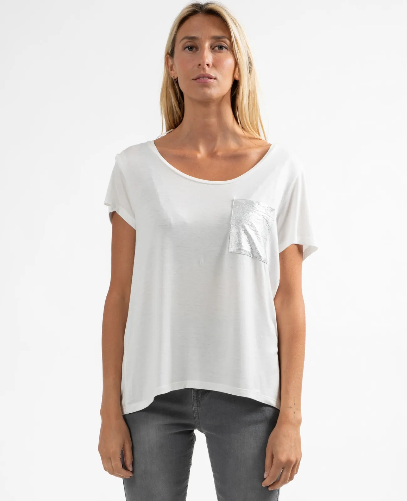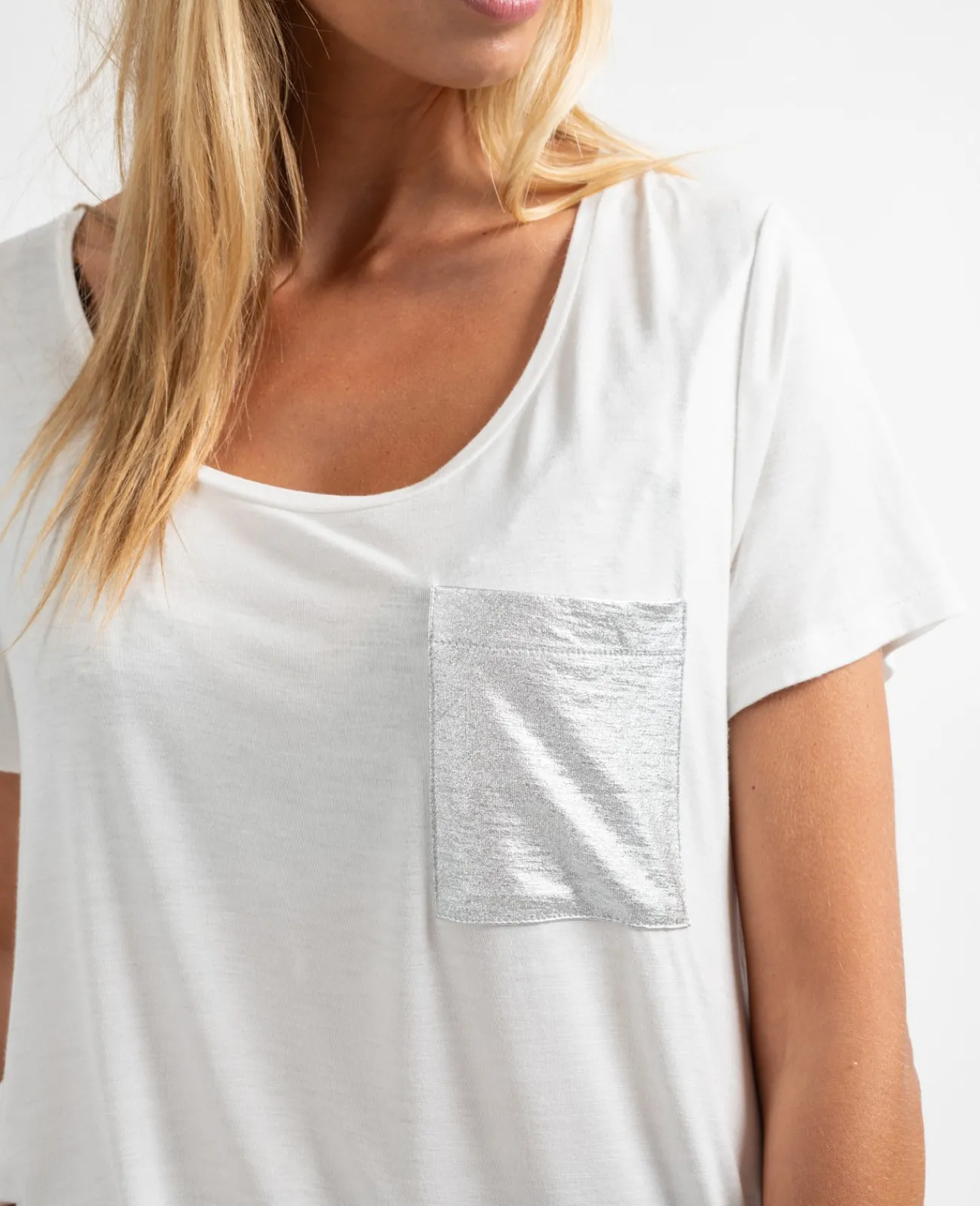Col rond et manches courtes, c’est le basique du dressing féminin. Avec sa poche poitrine et sa coupe près du corps, on ne le quitte plus !