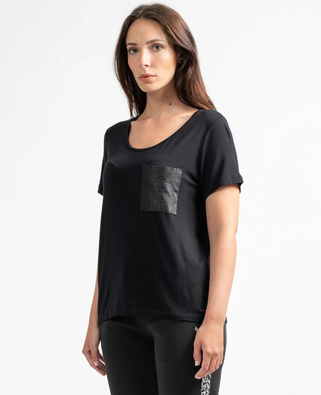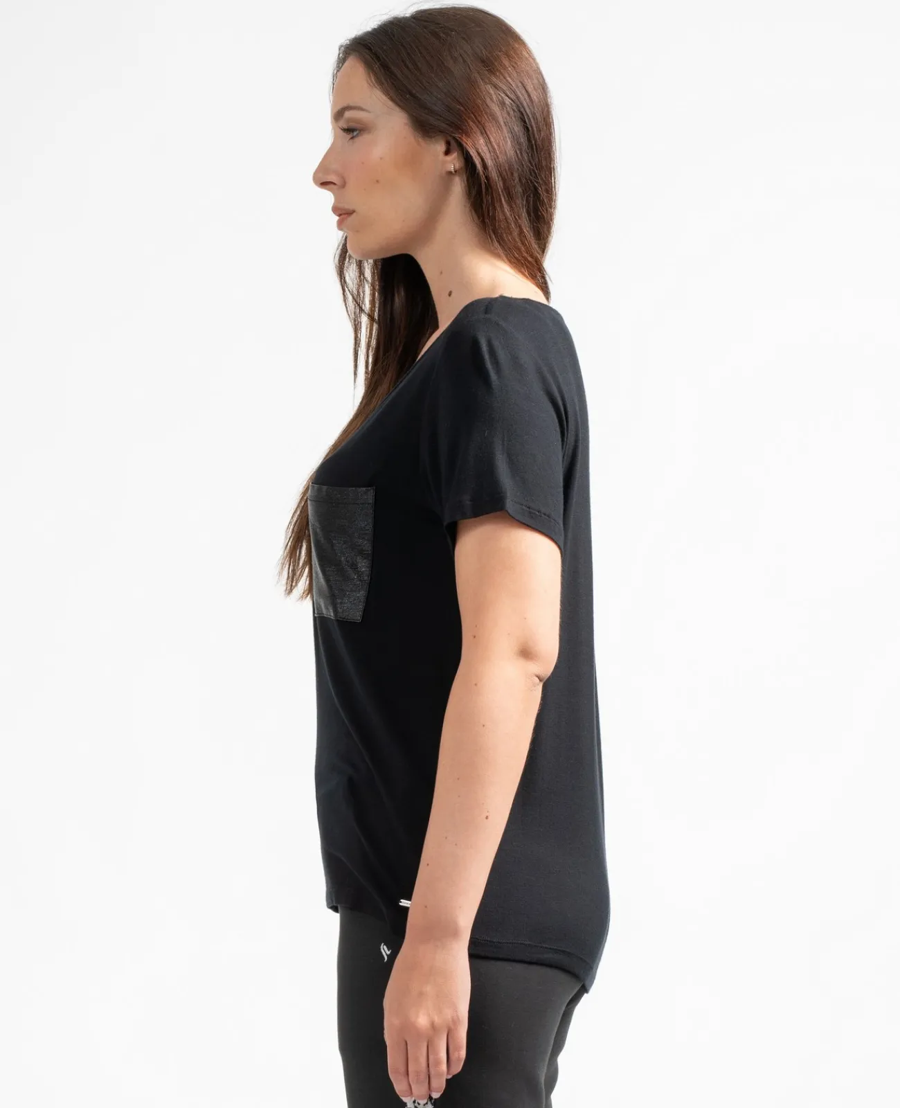 Col rond et manches courtes, c’est le basique du dressing féminin. Avec sa poche poitrine et sa coupe près du corps, on ne le quitte plus !