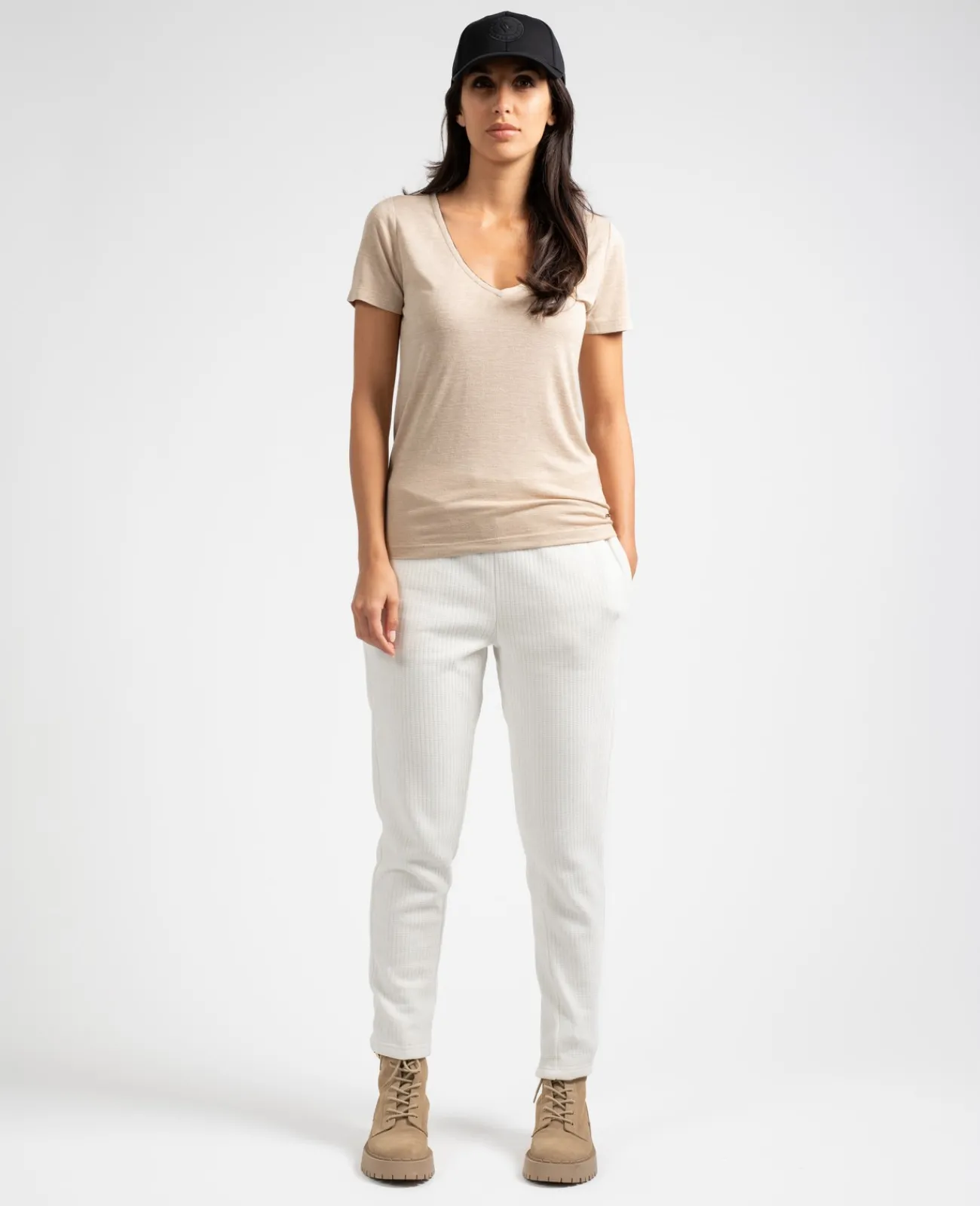 Incontournable du vestiaire, notre t-shirt à manches courtes est en polyester et viscose pour un aspect léger et une tenue parfaite. Son col V lui apporte une touche féminine.