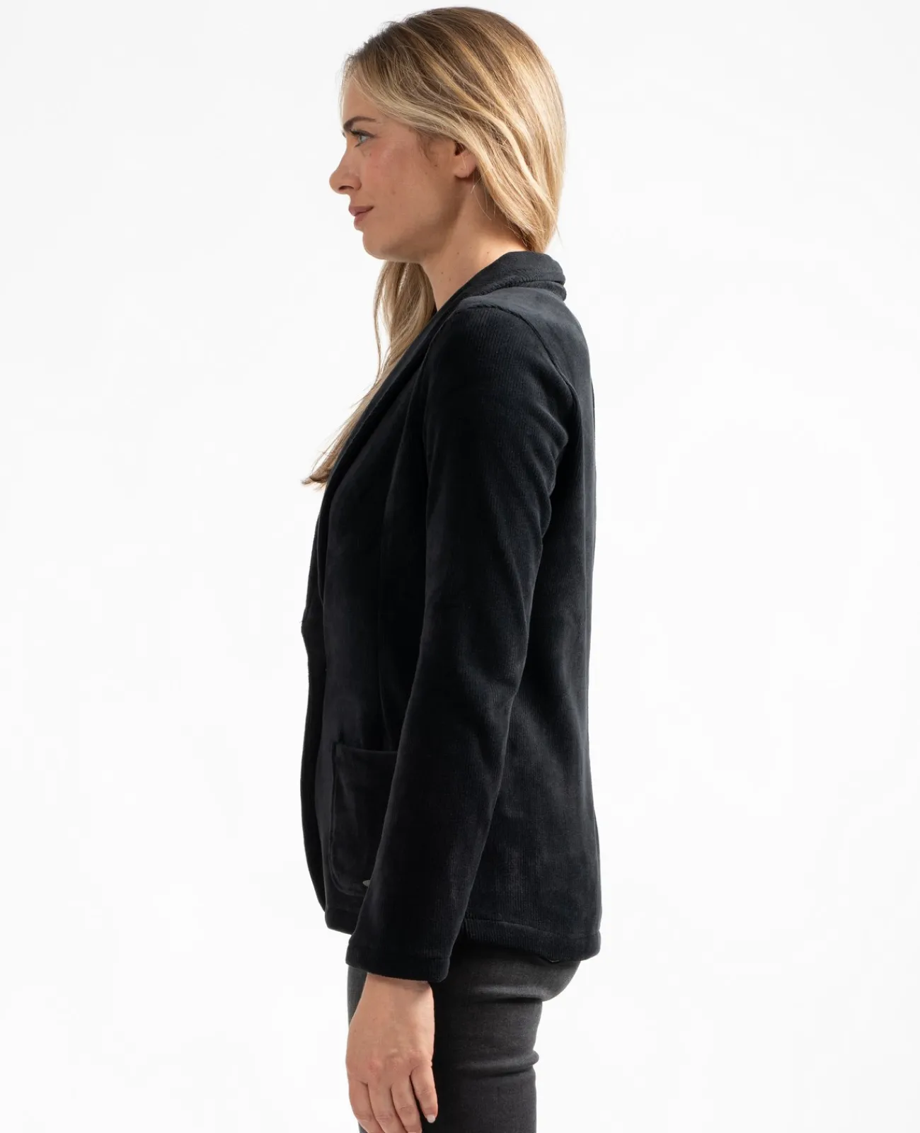 Matière stretch pour ce blazer en velours que l’on mixe avec un jean ou un pantalon. Une matière douce et agréable à porter et un tissu quasi infroissable pour pouvoir l’emporter partout.